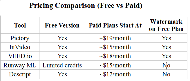 Free plans are particularly useful for beginners, content creators, and affiliate marketers who want to experiment with video creation without committing to expensive subscriptions.