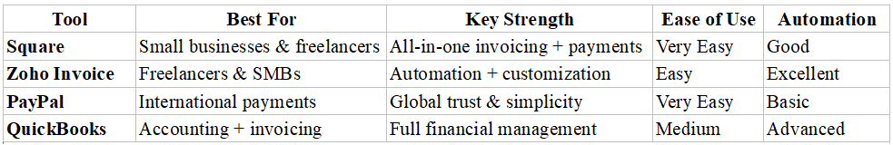 Solutions like Zoho Invoice, Square, and PayPal provide powerful features that simplify invoicing and improve cash flow.